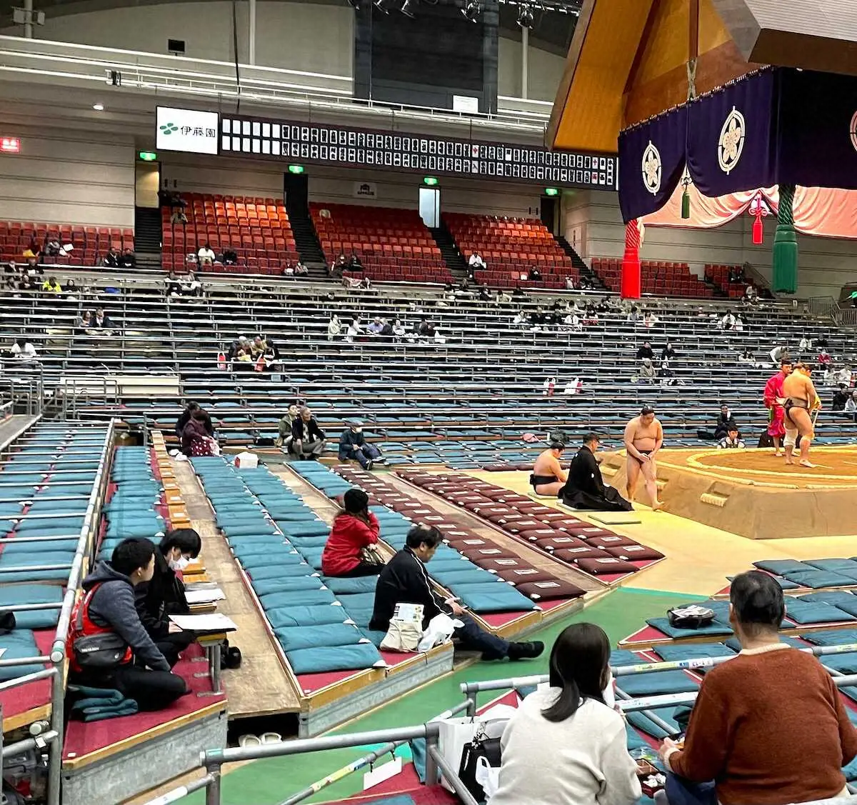 <春場所3日目>赤いビブスを着た救急救命士(左下)が今場所から土俵近くの席に常駐