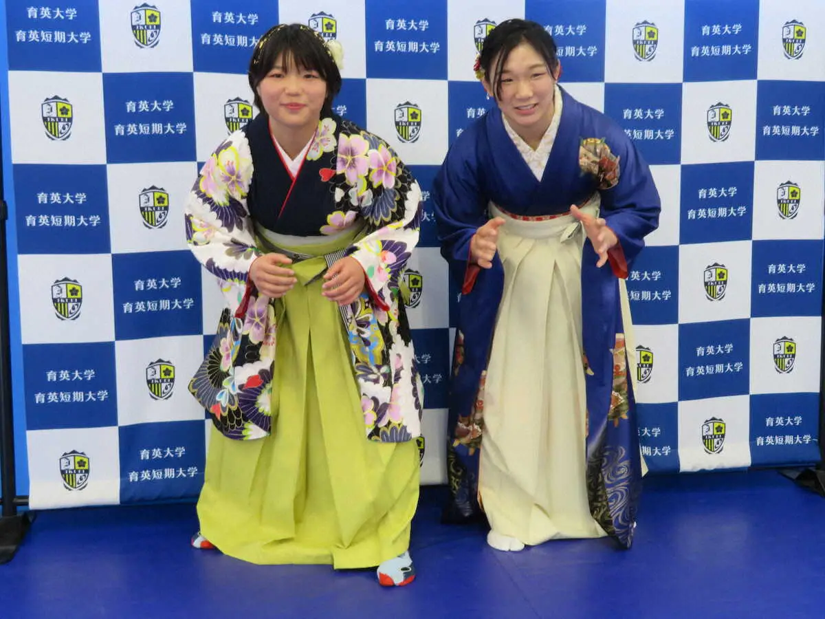 卒業式後、袴姿でレスリングの構えのポーズを取る桜井つぐみ(左)と元木咲良