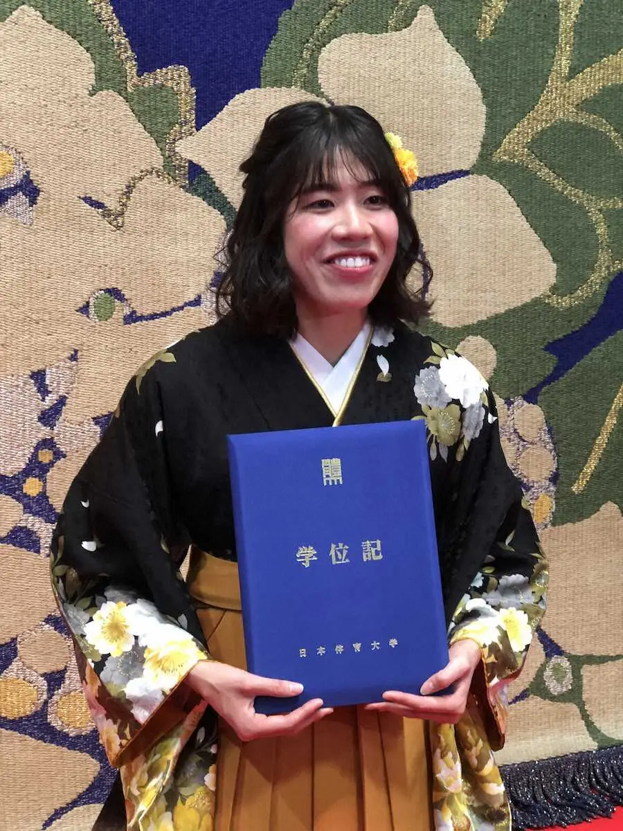 日体大の卒業式が15日、都内の同大世田谷キャンパスで行われ、パリ五輪代表に内定しているオープンウオータースイミング(OWS)女子の蝦名愛梨(22)が出席した。