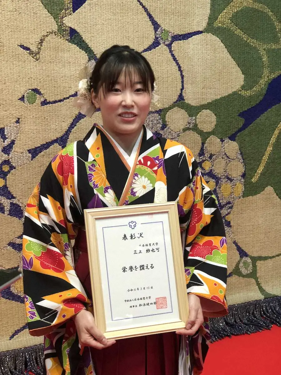 日体大の卒業式が15日、都内の同大世田谷キャンパスで行われ、飛び込みのパリ五輪代表に決まっている三上紗也可(23)が出席した。