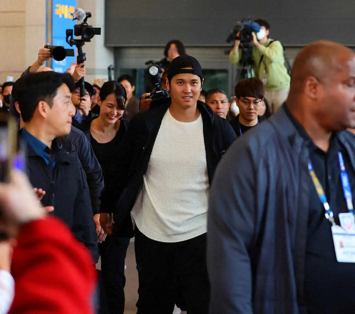 夫人と一緒に韓国に到着した大谷(撮影・光山 貴大)