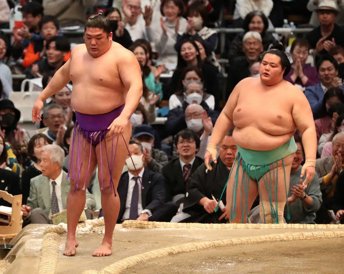 9日目には三役初挑戦で小結・阿炎と激突するも押し出しで下し、無敗をキープ。前日の10日目には1敗の平幕・大の里との優勝争い直接対決が実現。出世が早過ぎて大銀杏(おおいちょう)が結えない新鋭同士の直接対決はちょんまげの尊富士に軍配。無傷の10連勝で後続と2差に広げ、単独首位を独走。10日目終了時で平幕の2差単独首位は昨年春場所の翠富士以来、1場所15日制となった1949年夏場所以降では4例目という出来事だった。