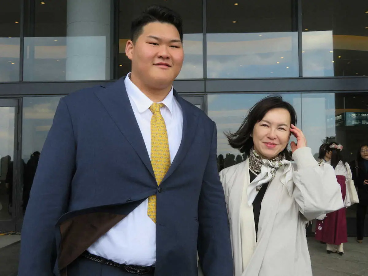国士舘大の卒業式後、記念撮影に応じる斉藤立と母・三恵子さん