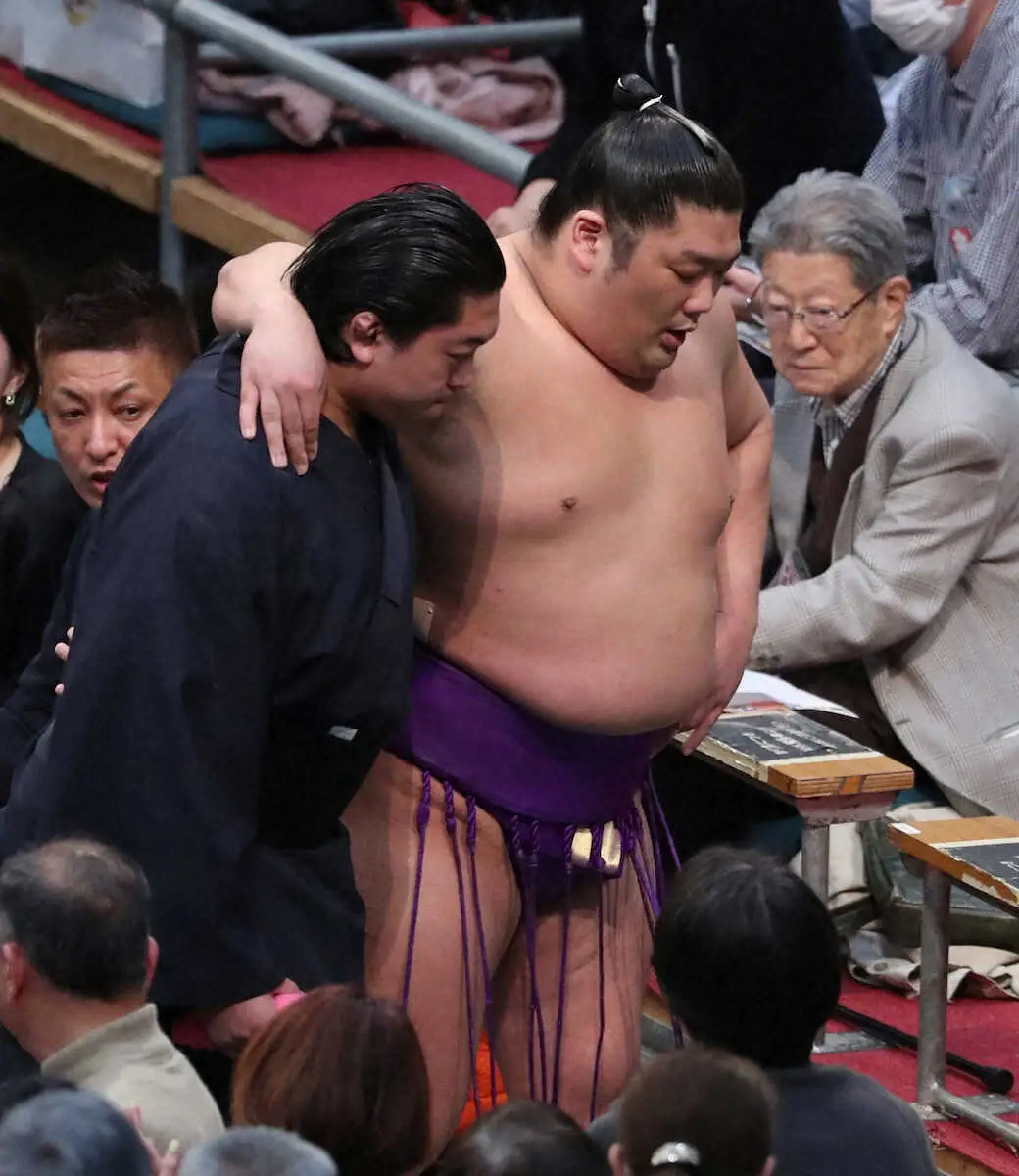 <大相撲春場所14日目>肩を借り支度部屋に戻る尊富士(右)(撮影・後藤 正志)