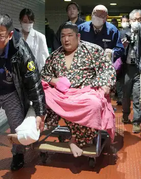 付け人の肩を借りてゆっくり歩いてから、車椅子に乗って花道を退場。支度部屋へは戻らず、医務室へ運ばれた。右足首をギプスで厳重に固定し、救急車で大阪市内の病院へ。痛がるような苦悶(くもん)の表情ではなく、目の前の厳しい現実にただただぼうぜんとしているようだった。