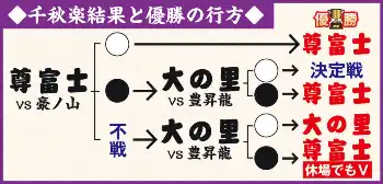 大の里は本割、決定戦で連勝することが条件。ただし、尊富士が千秋楽の土俵に立たなければ、豊昇龍を破れば決定戦が不戦勝となり初優勝が決まる。