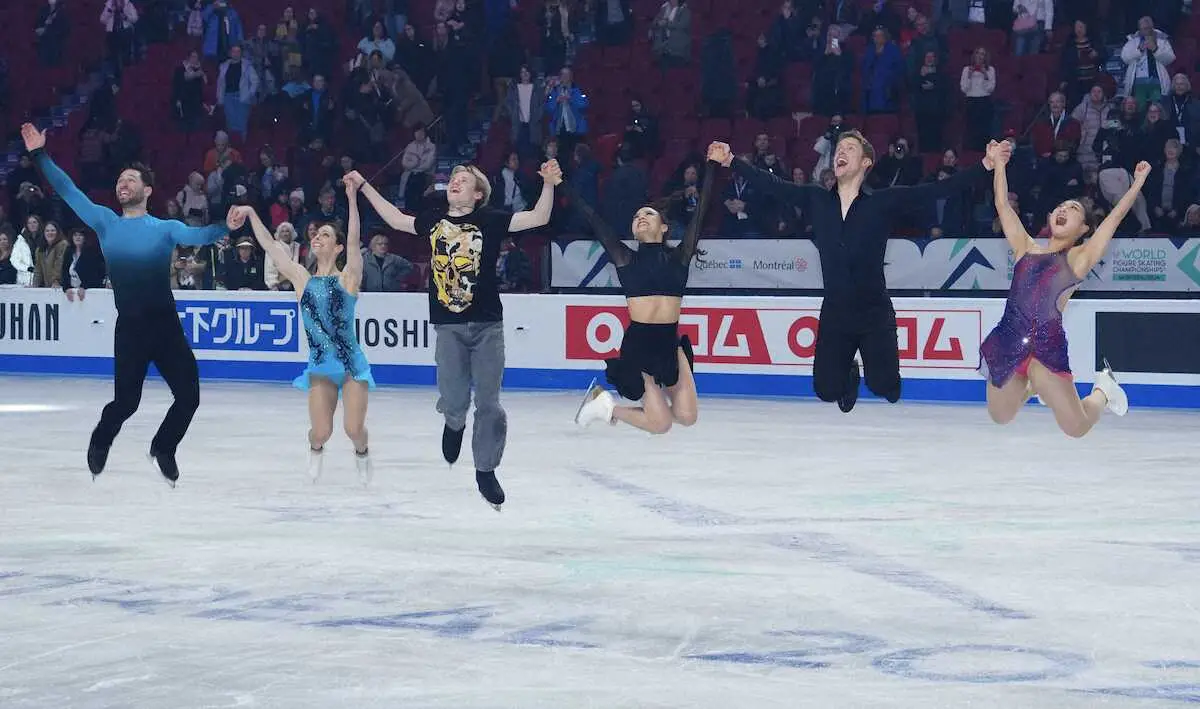 <世界フィギュアエキシビション>恒例となった勝利のジャンプをする(左から)マキシム・デシャン、ディアナ・ステラートデュデク、イリア・マリニン、マディソン・チョック、イヴァン・ベイツ、坂本花織(撮影・長久保 豊)