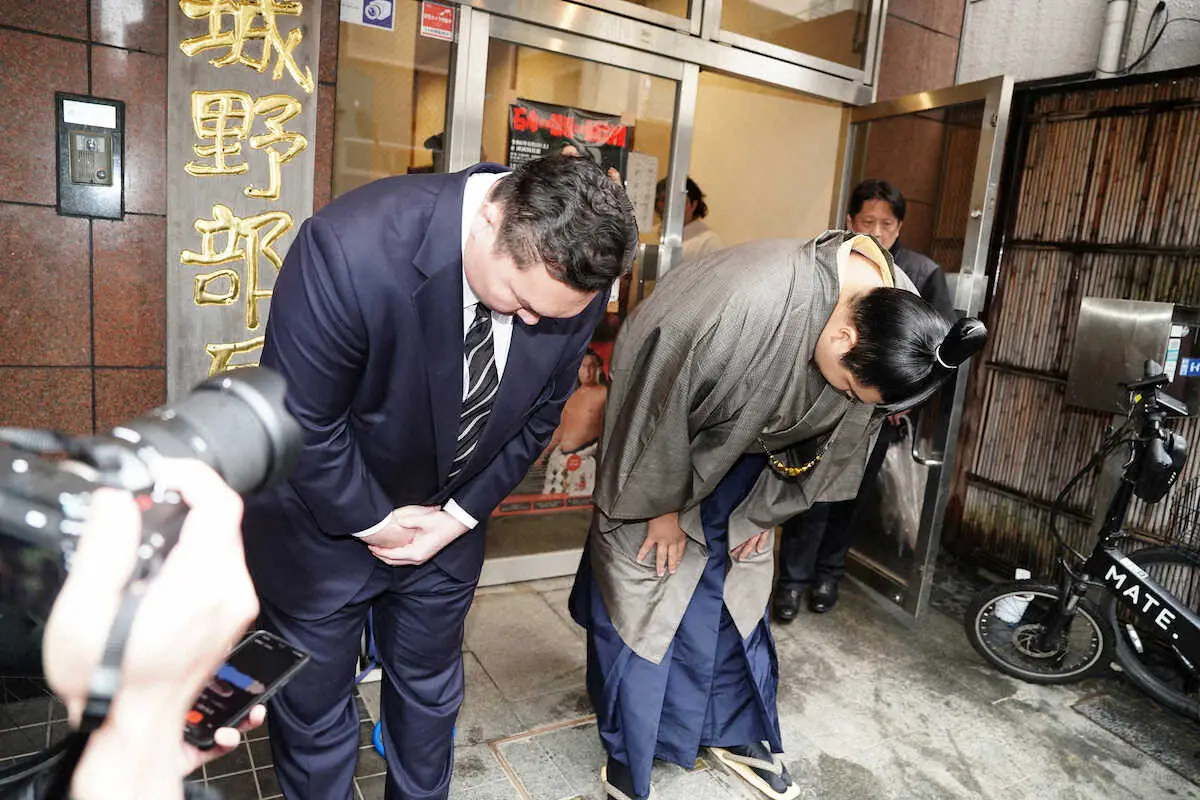 <宮城野部屋関連>頭を下げる宮城野親方(左)と北青鵬(撮影・島崎忠彦)