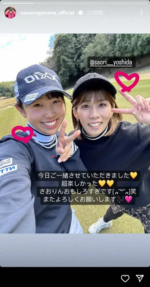 27日にヤマハ・レディース葛城のプロアマ戦で吉田と同じ組で回り、「ご一緒させていただきました 超楽しかった さおりんおもしろすぎです 笑 またよろしくお願いします」とつづり、2ショットなどをアップした。