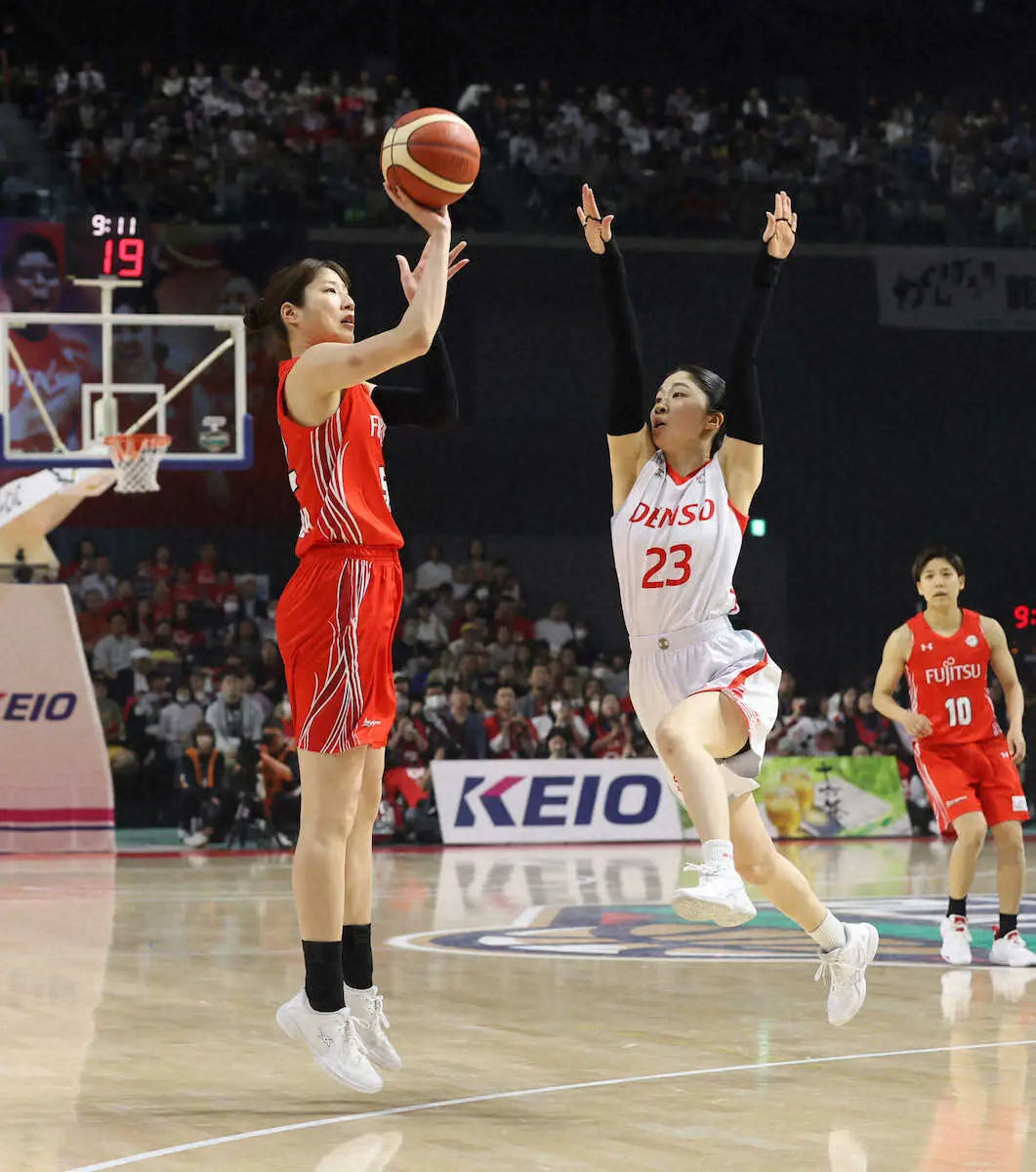 <Wリーグ 富士通・デンソー>第1クオーター、シュートを放つ富士通・宮沢(左)(撮影・西海健太郎)