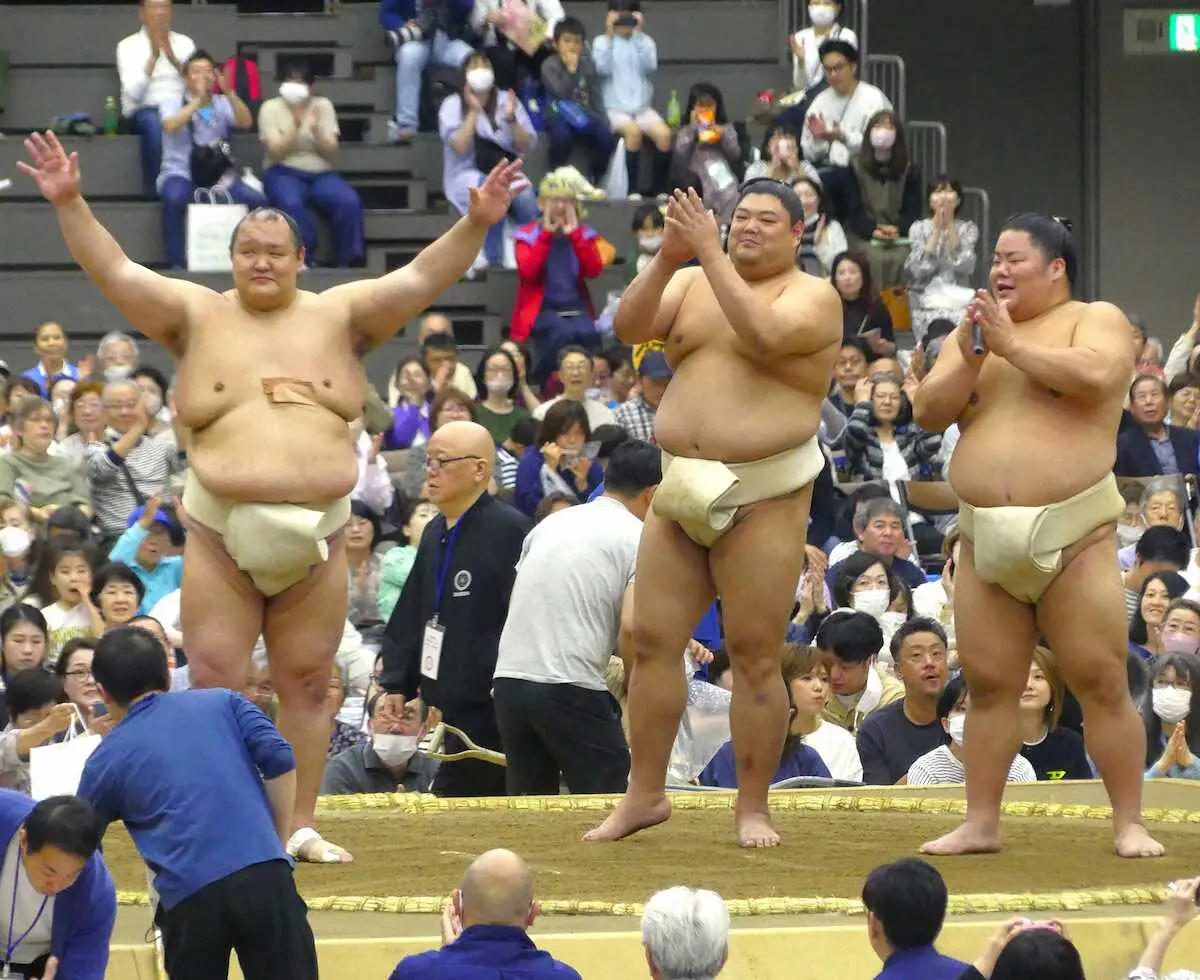 会場に訪れたファンからの質問コーナーには、朝霞市出身の関脇・大栄翔(30=追手風部屋)と越谷市出身の小結・阿炎(29=錣山部屋)とともに埼玉県出身トリオで出演。年齢が近く小学生の頃から互いを知る仲の良い3人が息の合った掛け合いで盛り上げた。
