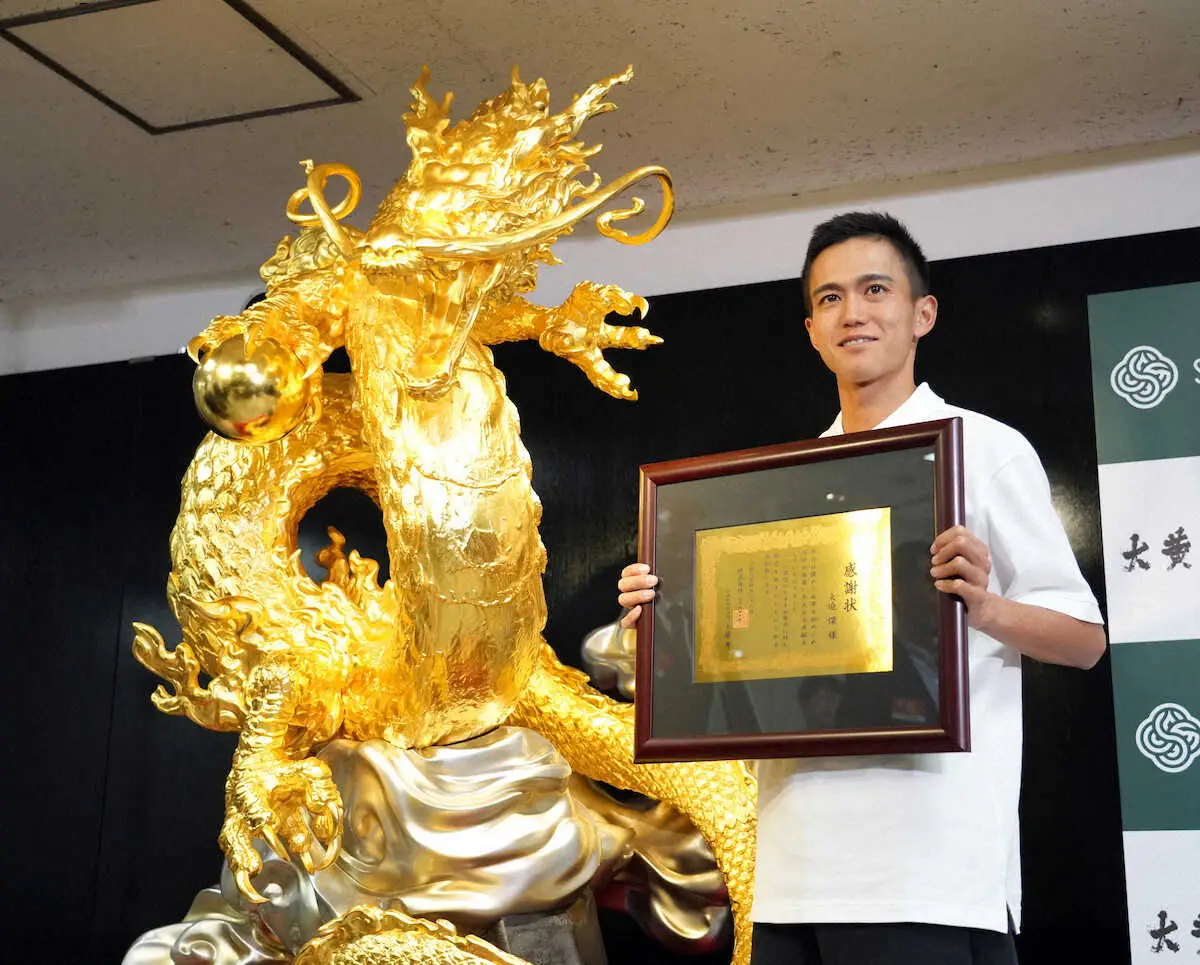 特別展示品の「黄金の龍」ので純金の感謝状を手に笑顔を見せる大迫(撮影・高橋 茂夫)