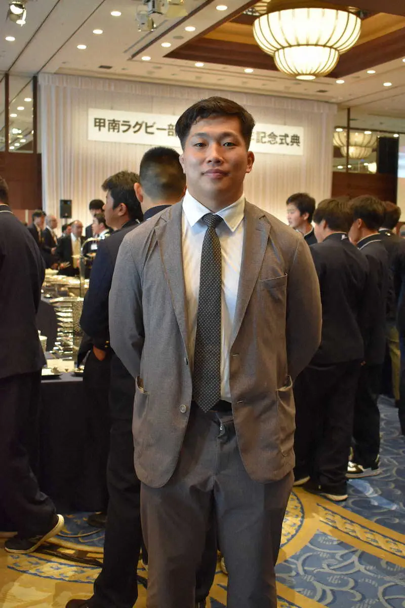 甲南高時代にキャプテンを務め、京都産業大に進学後に関西大学Aリーグでの優勝経験がある渡辺龍氏(69期生)もOBの一人として式典に参加。高校1年の時に全国高校ラグビー選手権兵庫県予選準決勝の報徳学園戦(2015年)が強烈な思い出として残っているといい「後輩たちには花園出場を果たしてほしい」と、エールを送っていた。日本ラグビー界のレジェンドの一人、平尾誠二さん(故人)との出会いがラグビーを始めるきっかけとなった渡辺氏は「ラグビーを通して人生観を学びました」と、100周年記念式典に際して改めてラグビーへの想いを再確認したようだった。