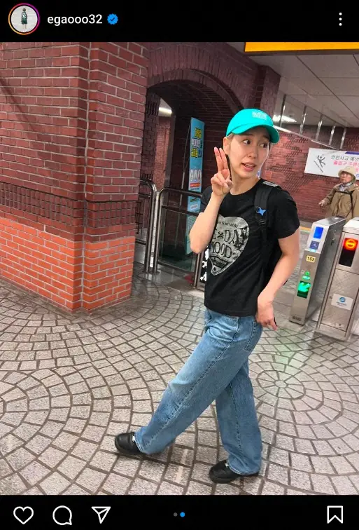 「韓国旅行での私服」とつづり、エメラルドグリーンのキャップに黒いTシャツ、デニムにスニーカー姿で街歩きしている写真をアップした。