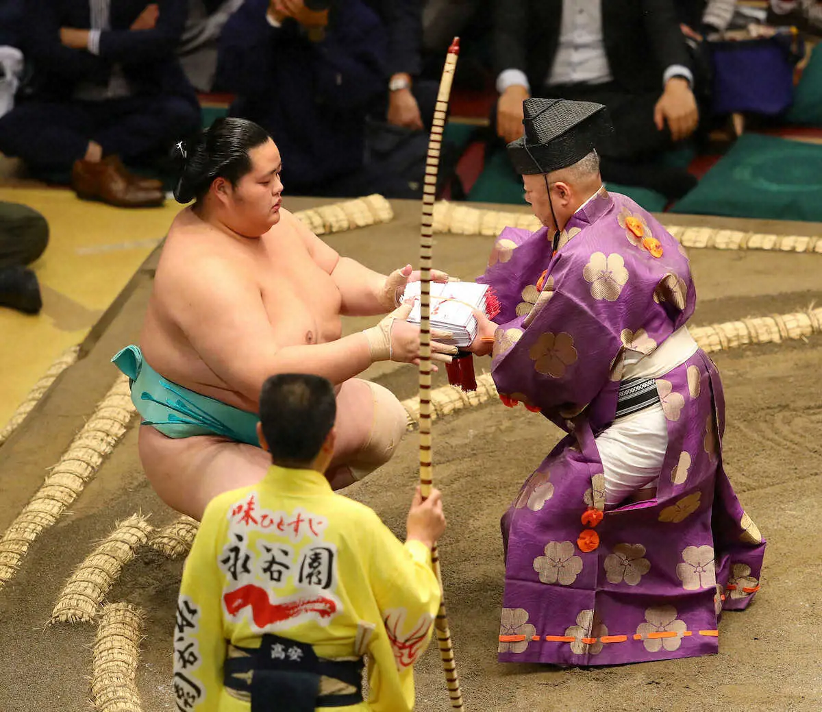 <大相撲夏場所2日目>懸賞を受け取る琴桜(撮影・松永 柊斗)