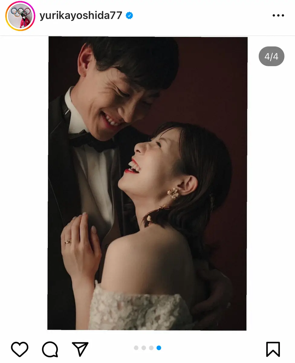 吉田は「私事ではございますが、この度入籍致しましたことをご報告させていただきます。お相手はスピードスケート日本代表の新濱立也さんです」と発表。