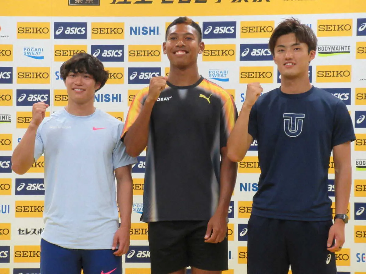 18日に国立競技場内で記者会見が実施され、第1部では男子100メートルに出場するサニブラウン・ハキーム(東レ)、柳田大輝(東洋大)、坂井隆一郎(大阪ガス)が出席した。