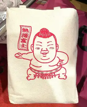 熱海富士の本名「朔太郎」にちなんで「TEAM Saku」と書かれたおそろいの赤いTシャツに加え、同後援会は今回オリジナルのグッズを新たに作成。イラストレーターの山本ミカコさんがデザインした熱海富士の似顔絵入りトートバッグが、一部の後援会関係者に配られた。