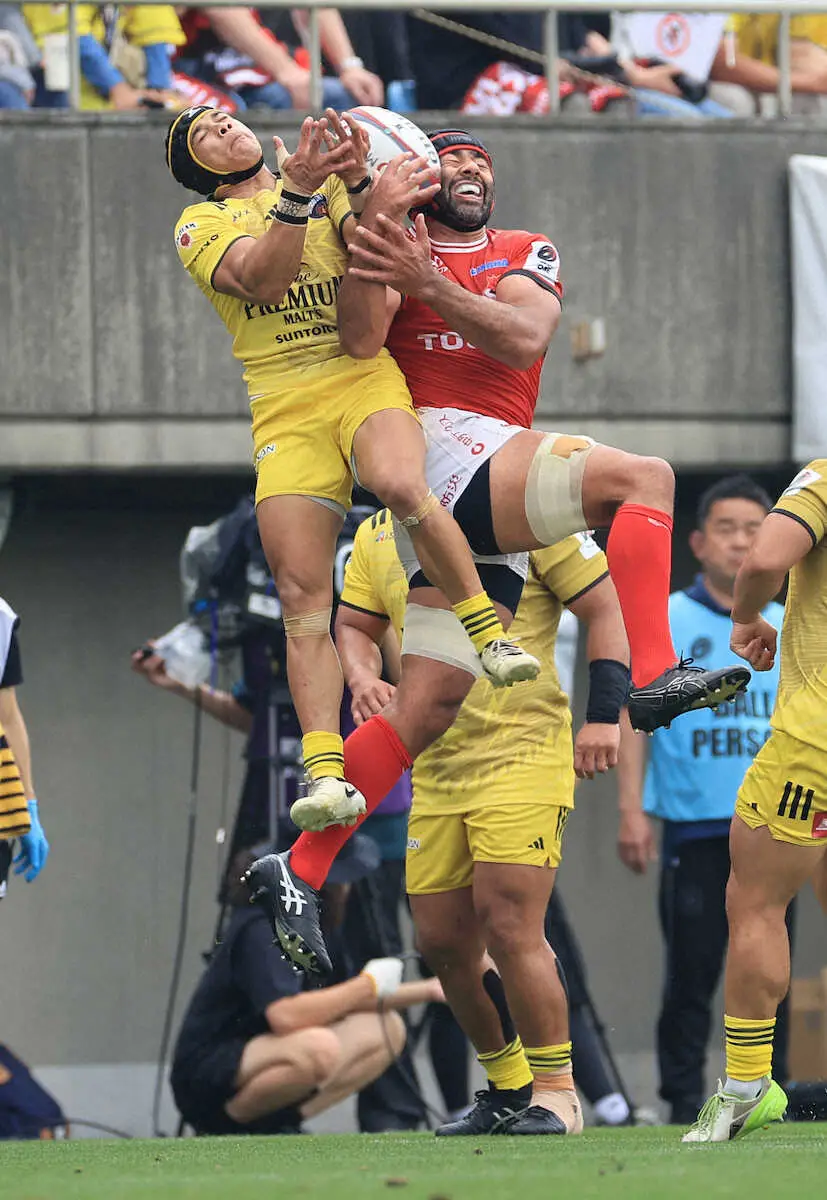 <BL東京・東京SG>前半、ハイボールを競り合うコルビ(左)とリーチ(撮影・篠原岳夫)