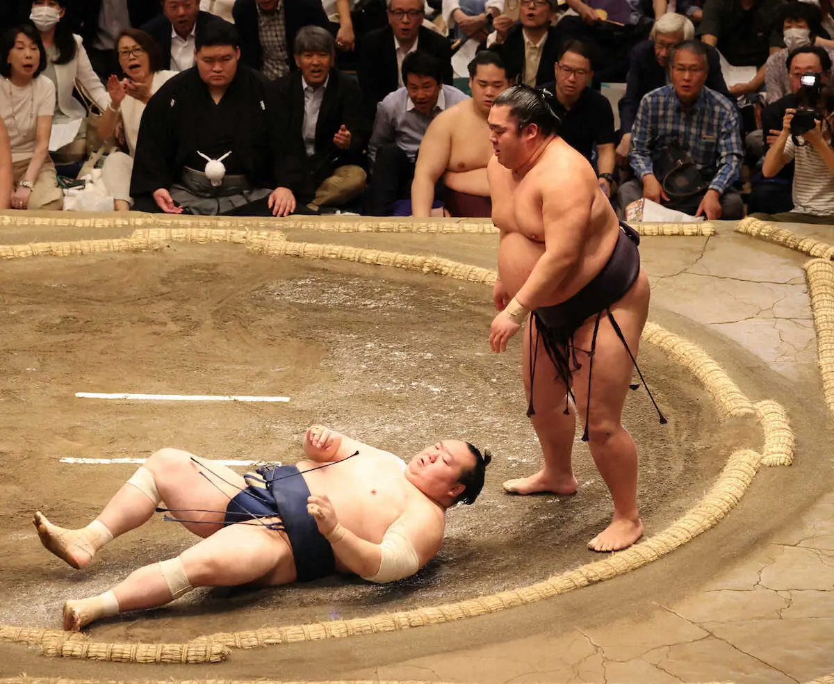 前日に結びの一番で元大関・高安との一戦に敗れた大関・琴桜は、平幕・明生と激突。土俵際まで追い詰められるも、上手投げで下し、意地を見せた。大関2場所目の今場所、琴ノ若から改名し、先代師匠で偉大な祖父のしこ名である琴櫻を襲名。改名後初の勝ち越しとなった。