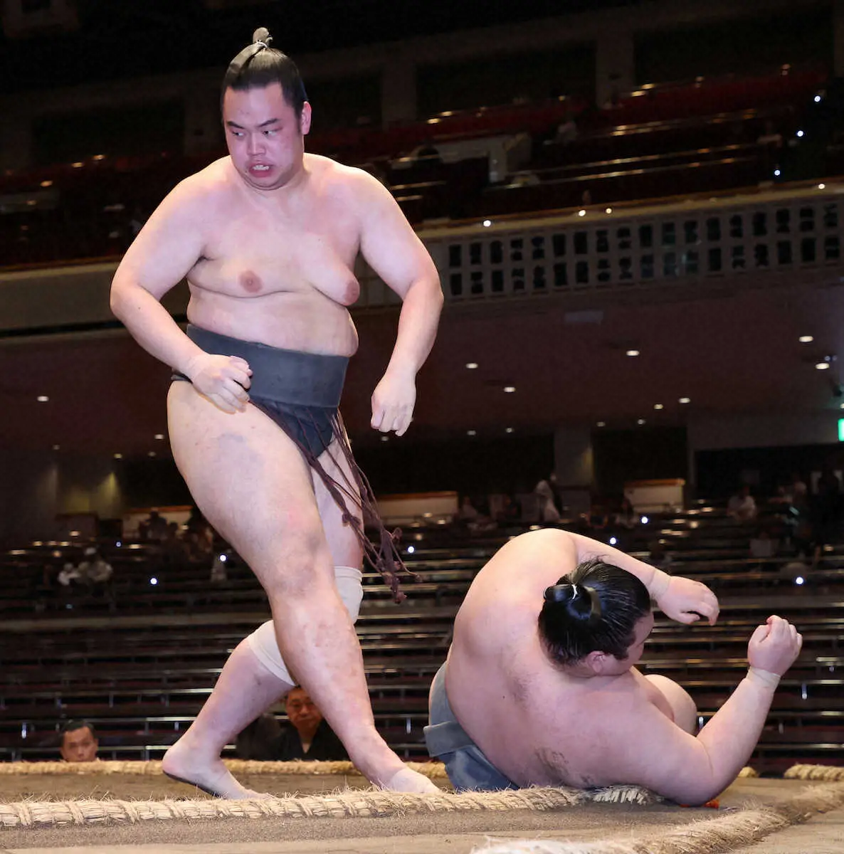 激しい突き押しを持ち味とする三段目上位経験者の優力勝を相手に、1メートル83の長身を生かして右上手を取って得意の左四つで胸が合う展開に。相手の動きを止めて有利な体勢をつくると、左の差し手を返しながら前に出て寄り倒した。「全力でやって、疲れ切りました」。自身初の7戦全勝を決め、息を切らせながら必死の相撲内容を振り返った。