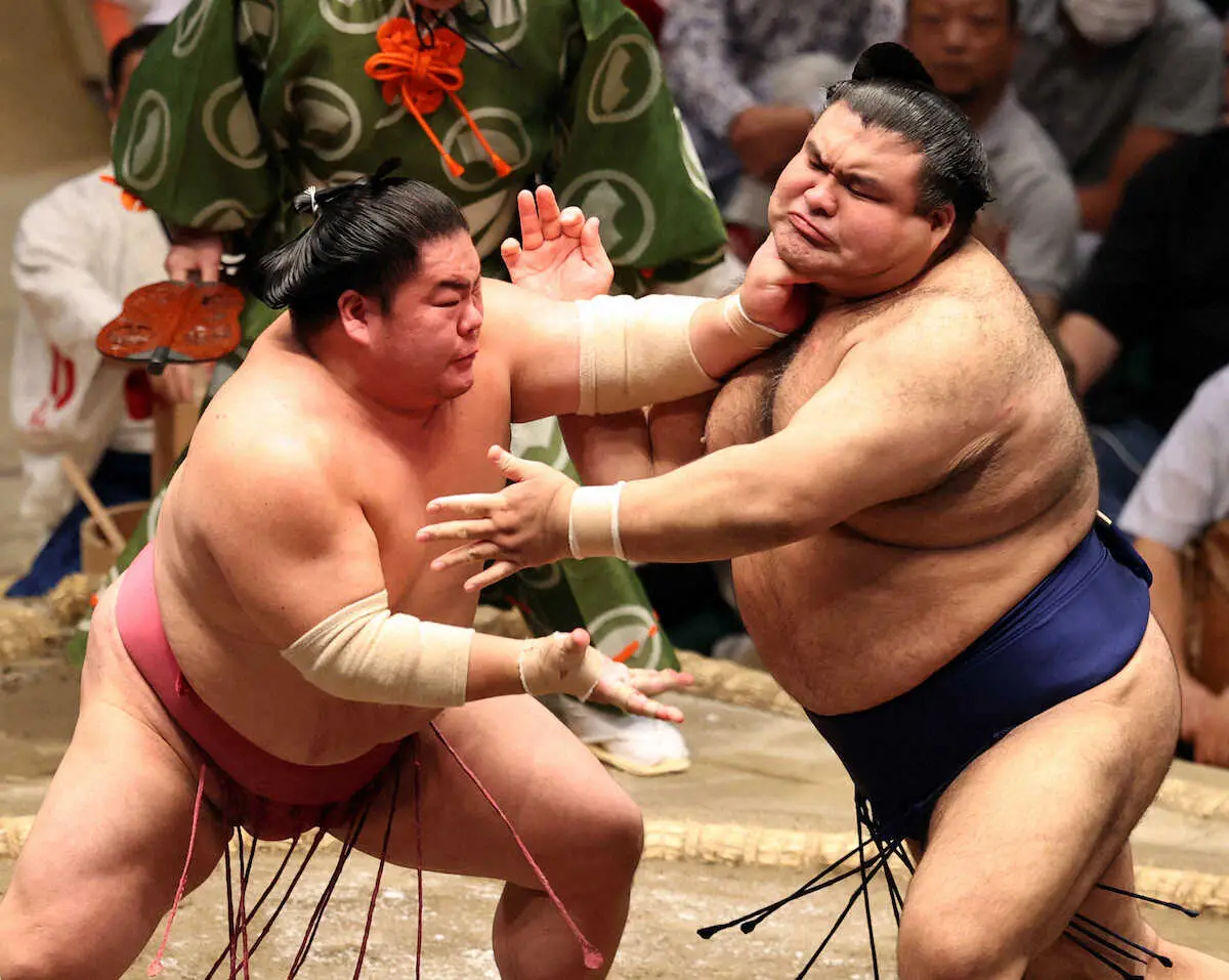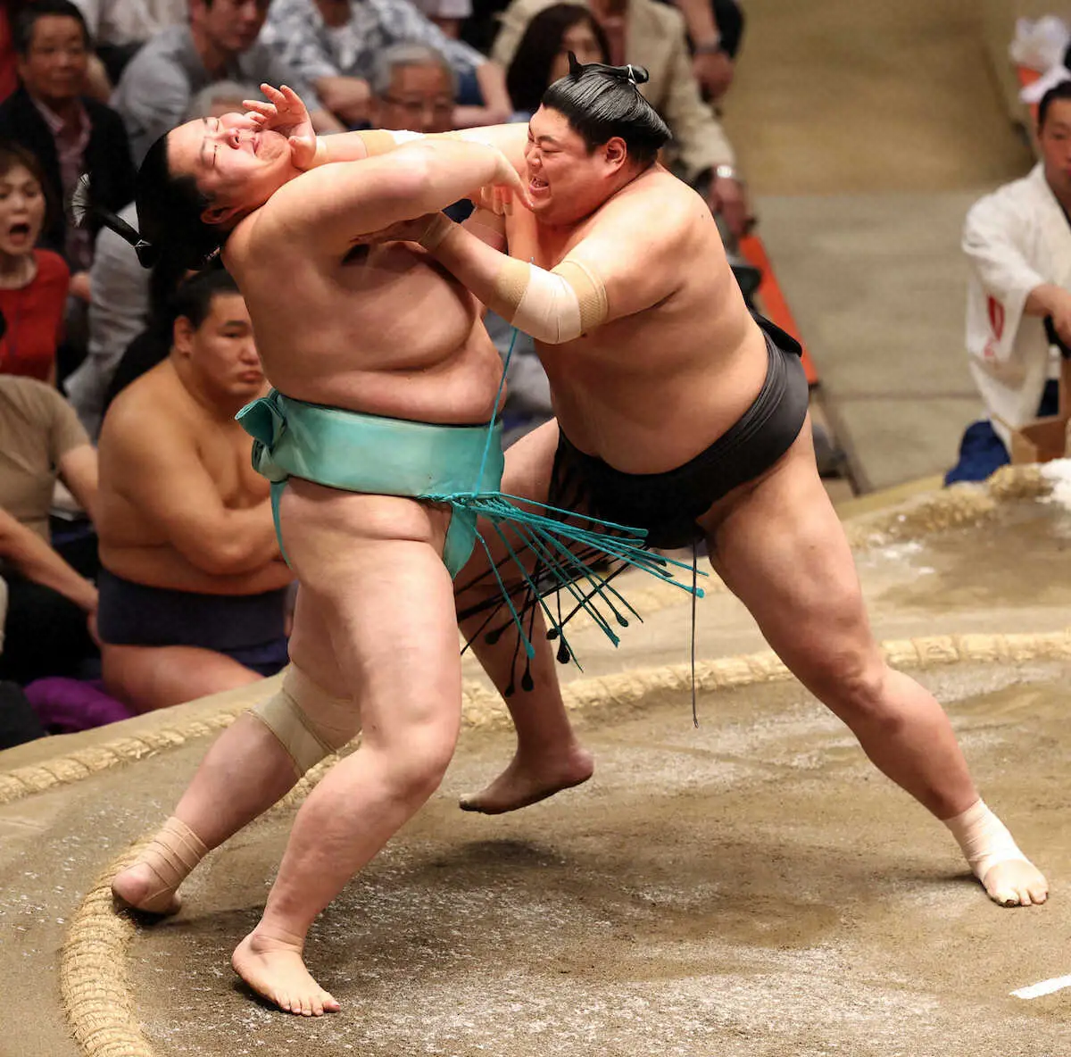 <夏場所14日目>湘南乃海(左)を押し出しで下す大の里(撮影・久冨木 修)