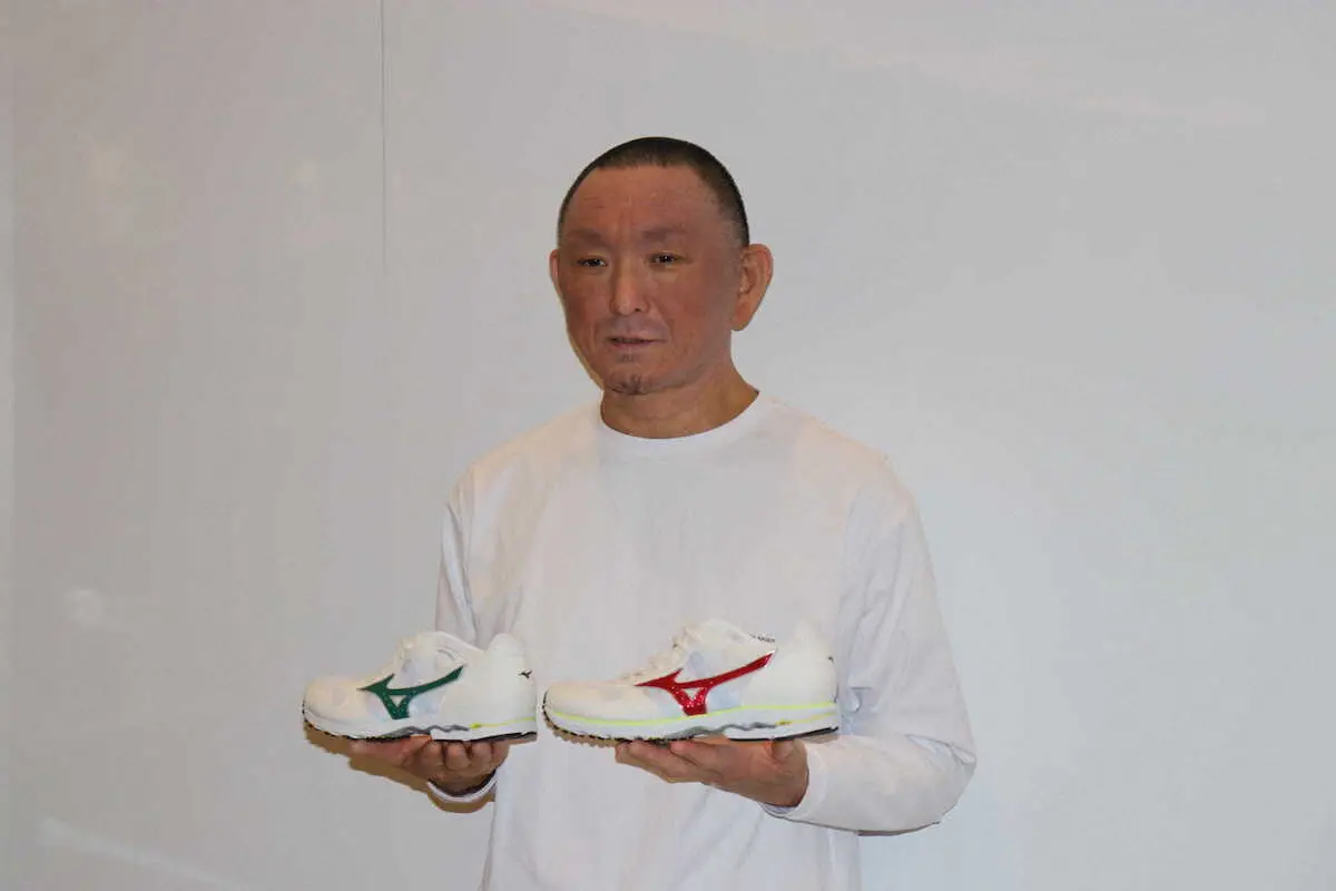 パリ五輪競歩代表の池田向希(旭化成)と川野将虎(旭化成)が着用するシューズを担当するミズノのシューズ職人・亀井晶さんが27日、都内で競歩用シューズについて説明した。