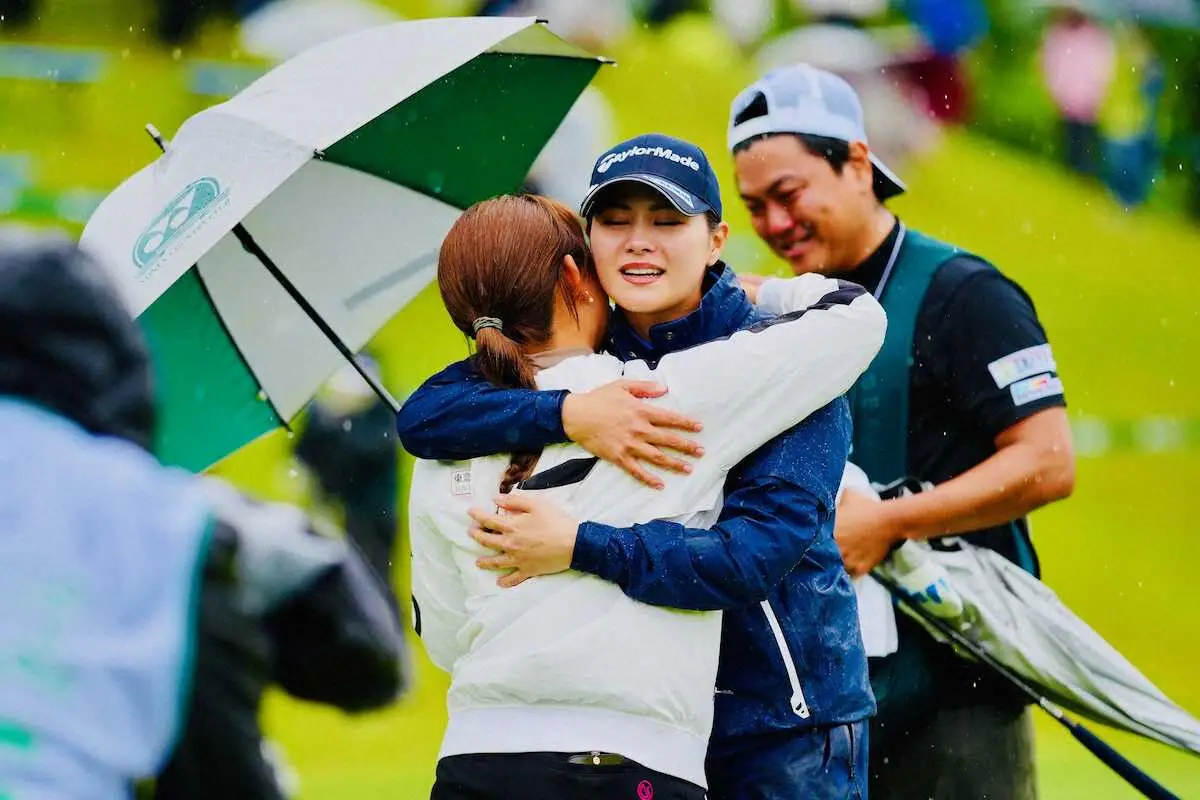 新垣比菜が涙の6年ぶりV 黄金世代の大里桃子、吉本ひかるが雨の18番グリーンで祝福