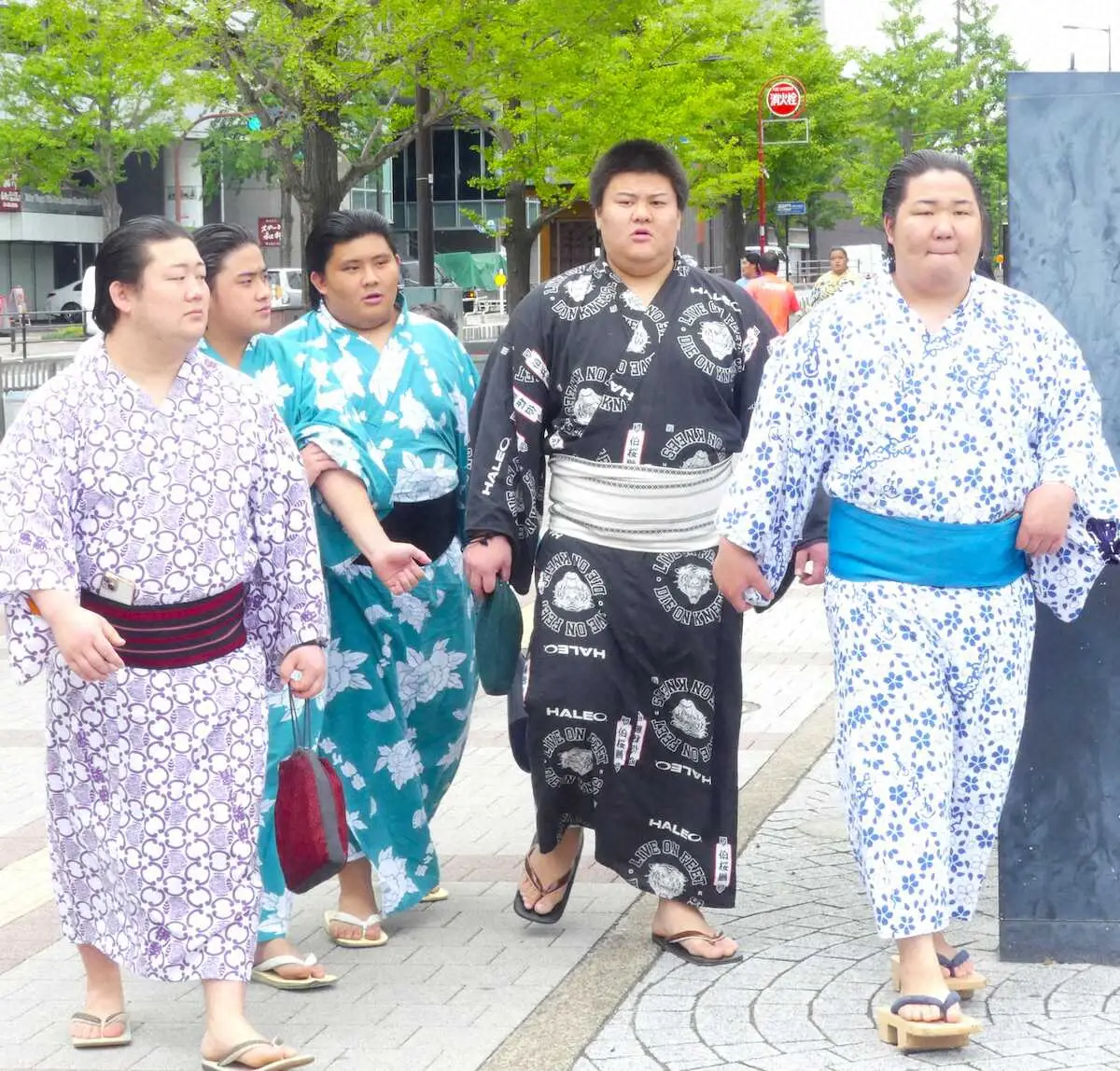 相撲教習所の授業を終えて帰路に就く(左から)松井、天ノ富士、宮富士、草野、宮崎(撮影・前川 晋作)