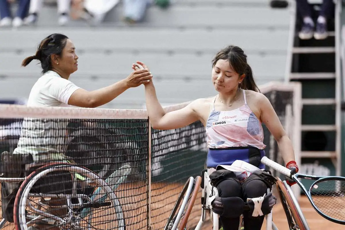 車いすの部女子シングルス準決勝で敗れた大谷桃子(右)=パリ(共同)