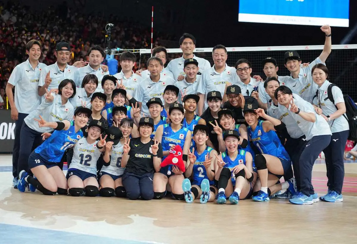 ネーションズリーグ 女子<日本・セルビア>セルビアに勝利した日本の選手たちオリンピック出場を祝い記念撮影する(撮影・岡田 丈靖) Photo by スポニチ 【バレーボール】パリ五輪出場決定の日本女子、気になるメンバー選考は … ギャラリーで見る この記事のフォト 2024年06月15日の画像一覧 もっと見る 2024年06月15日の画像をもっと見る