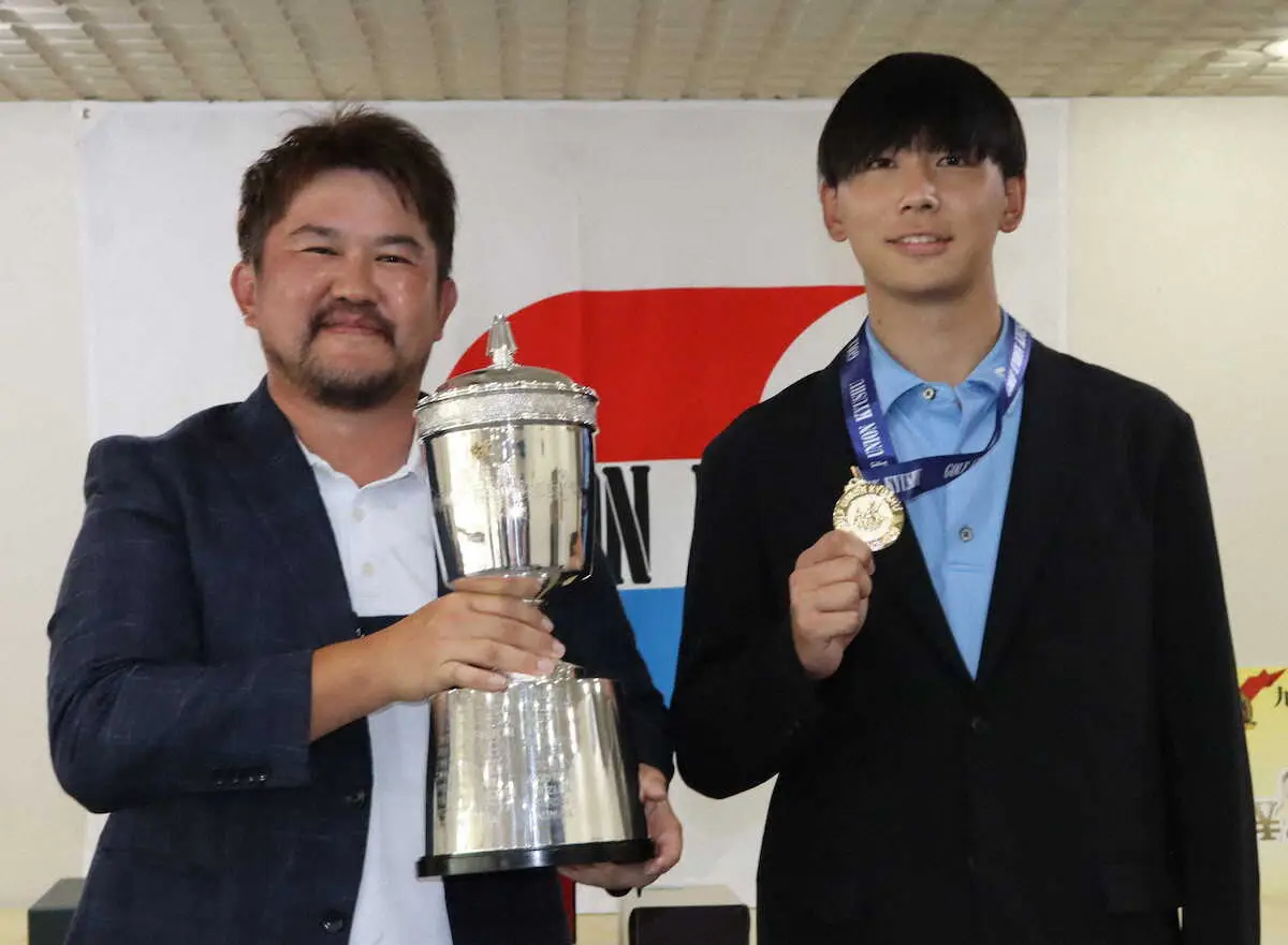 九州オープンゴルフ最終日大会初優勝の林拓希(左)は優勝カップを手に笑顔、右はベストアマの遠藤崇真