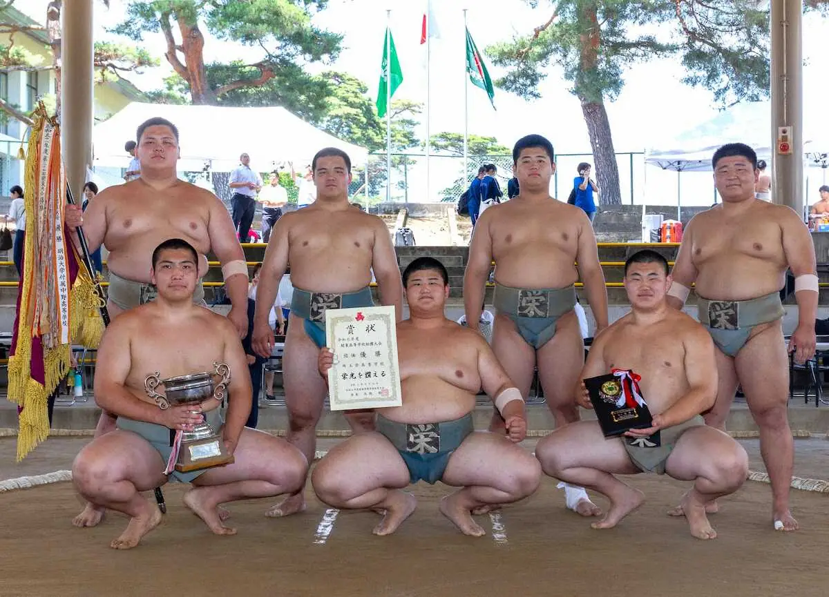 関東高校相撲大会で団体戦18連覇を果たした埼玉栄。(前列左から)木村豪太、田宮愛喜、中澤睦士、(後列左から)鮫島輝、奥田蒼真、山田晴ノ介、斎藤忠剛