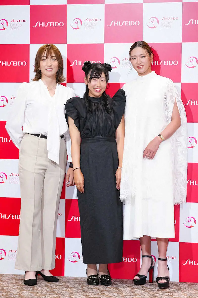 脇元華(26=GMOインターネットグループ)は白のシャツにベージュのパンツを合わせたスマートなスタイル、原英莉花は白のドレスに黒のヒールを合わせた爽やかな装いを披露。3人は笑顔でスリーショットに納まった。