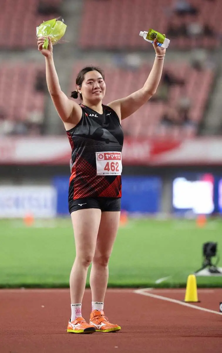 長い髪を後ろで左右お団子にした“ニューヘア”で登場した北口。注目の1投目は61メートル10と、まずまずの記録で全体2位にスタート。2投目で優勝記録となる62メートル87をマークし笑顔で声援に応えた。その後はファール3本に50メートル台に終わったが、悔し涙を流した昨年のリベンジを果たし、ホッとした表情を見せた。