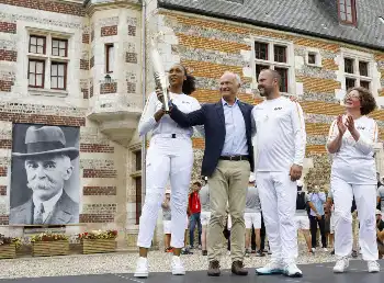 クーベルタン男爵ゆかりの地 ミルビルの城館に聖火 子孫のチボー・ドナバセル氏がランナーに