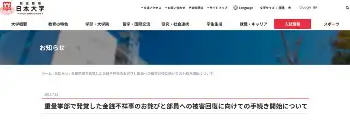 「重量挙部で発覚した金銭不祥事のお詫びと部員への被害回復に向けての手続き開始について」とのタイトルで公式サイトを更新。「本学重量挙部において、昨年12月まで10年間毎年、同部に納入されるべき入部金の徴収と同時に、入学時の本学への納付金(入学金・授業料等)の全部又は一部を免除されている奨学生部員からも納付金全額を代理徴収するという違法行為があった事実が、本学の調査(同部関係者からの聴取と金融機関から開示された10年分の口座内容の精査等)により判明しました」と報告した。