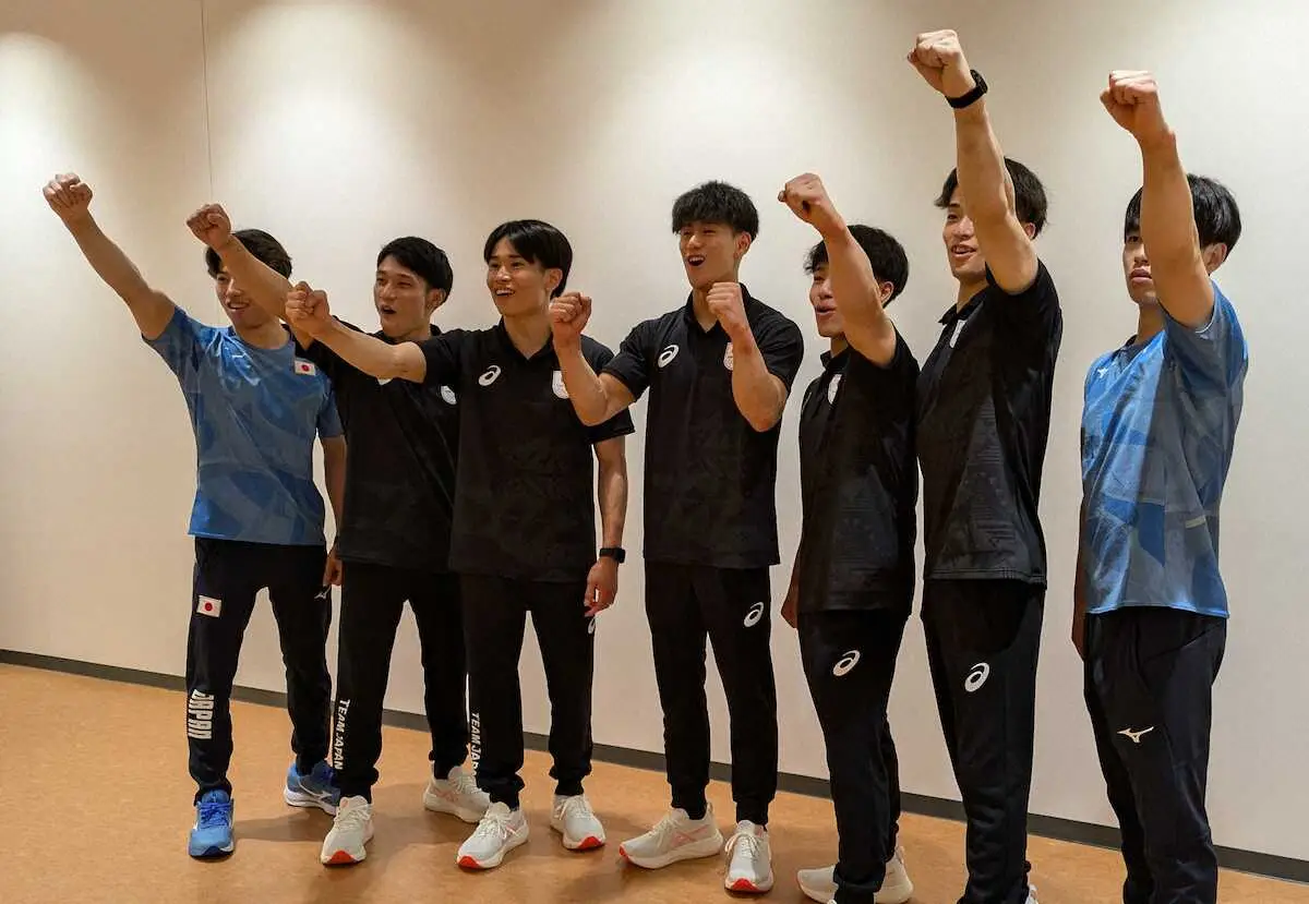 2大会ぶりの団体金メダルを目指す体操男子パリ五輪代表が14日、事前合宿地のフランス・リヨン出発前に羽田空港で取材に応じた。