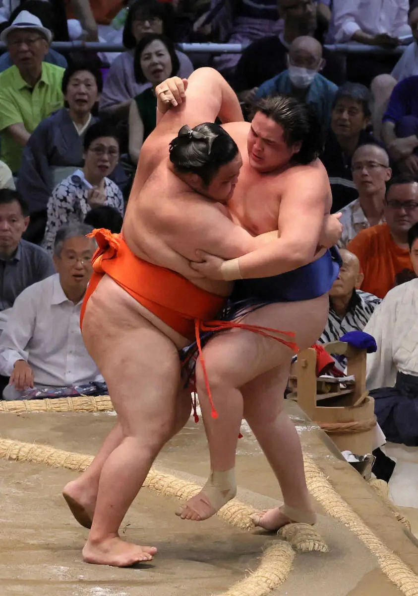 立ち合い左前ミツ狙いの相手に対し、体当たりから左の強烈な押しではじいて右差し。相手を正面に捉えて体重197キロの巨体を生かして休まず前に出て、左右どちらもまわしを取らないまま寄り切った。「前ミツ取ったら強いし距離を取られたら前さばきもうまい」と警戒した相手の長所を出させない作戦。「前ミツを取らせないようにはじいて」と狙い通りの速攻で底力を示した。