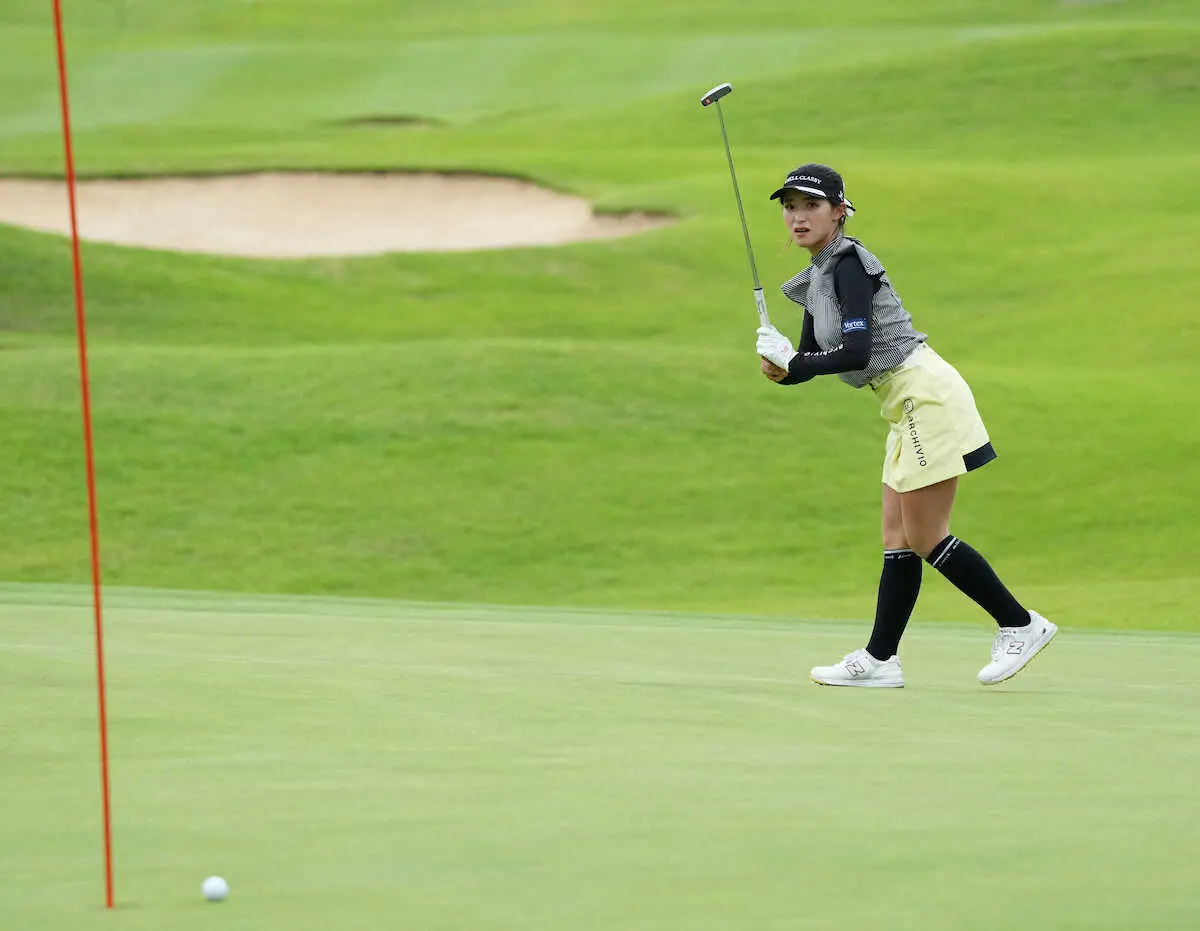 7位から出た臼井麗香(25=フリー)がボギーなしの9バーディーで大会コース記録を更新する63をマークし、通算14アンダーに伸ばして単独首位に立った。前日首位の三ケ島かな(28=ランテック)と青木瀬令奈(31=リシャール・ミル)が1打差の2位。パリ五輪代表の山下美夢有(22=加賀電子)は2日連続の67で回り、通算10アンダーの7位につけた。