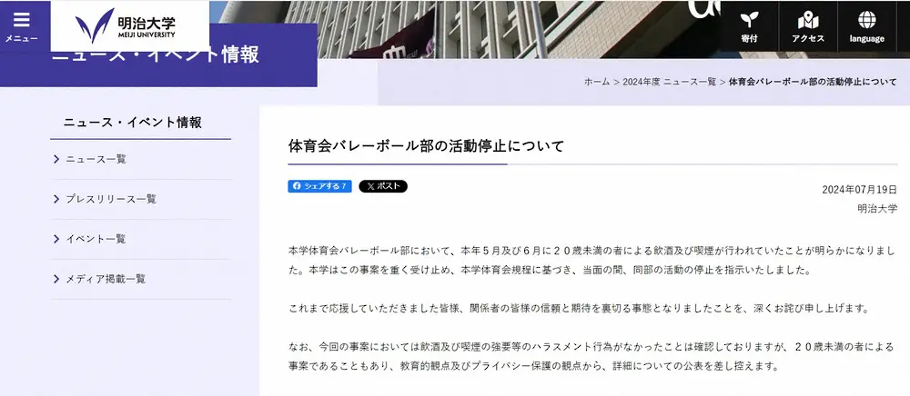 「本学体育会バレーボール部において、本年5月及び6月に20歳未満の者による飲酒及び喫煙が行われていたことが明らかになりました。本学はこの事案を重く受け止め、本学体育会規程に基づき、当面の間、同部の活動の停止を指示いたしました」と報告。