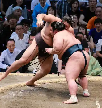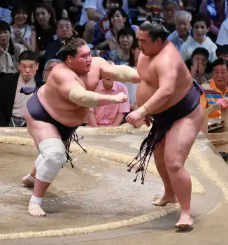 熱海富士が相手得意の左四つで若元春を寄り切る