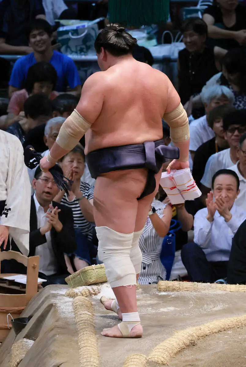 <大相撲名古屋場所・8日目>大量の懸賞を手に土俵を後にする照ノ富士(撮影・井垣 忠夫)