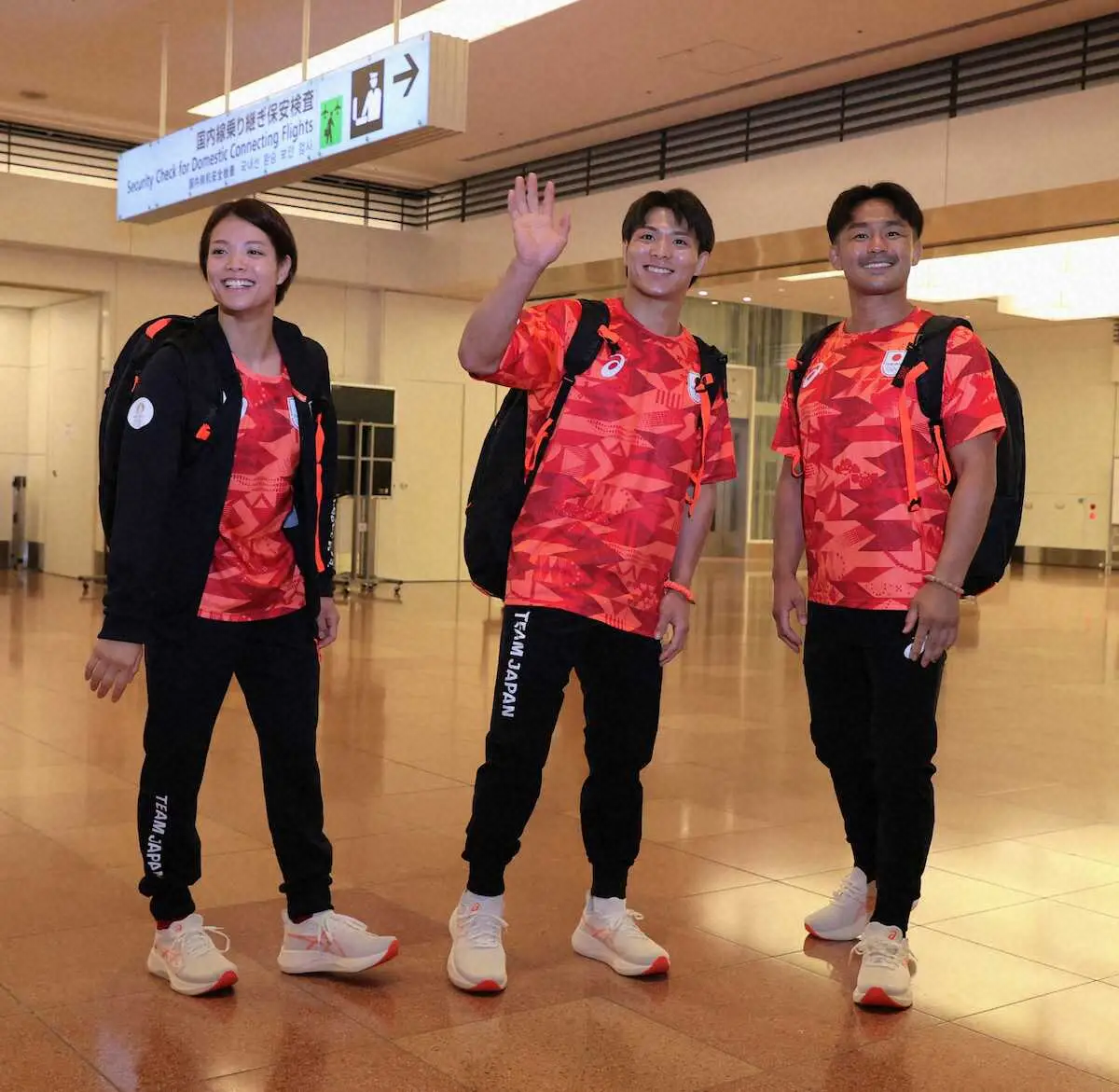 <柔道 出発>パリへ向け出発する(左から)阿部詩、阿部一二三、橋本(撮影・西海健太郎)