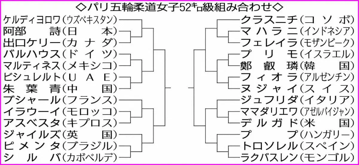 27日に競技が始まるパリ五輪の柔道は組み合わせ抽選会が25日に行われ、女子52キロ級で東京五輪金メダリストながらノーシードの阿部詩(24=パーク24)は、2回戦で世界ランキング1位のディヨラ・ケルディヨロワ(ウズベキスタン)と対戦する組み合わせが決まった。東京大会の決勝で対戦した地元フランスのアマンディーヌ・ブシャールとは、準決勝で相まみえることに。序盤から難敵が続くが、史上初の兄妹同日2連覇を必ず達成する。