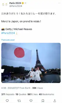 パリ五輪公式X「日本ありがとう!私たちはリレーを受け取ります」日本語で投稿 前回の東京大会に敬意