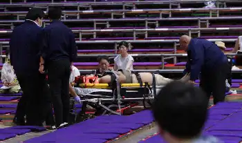 担架で運ばれる結山(撮影・長嶋 久樹)