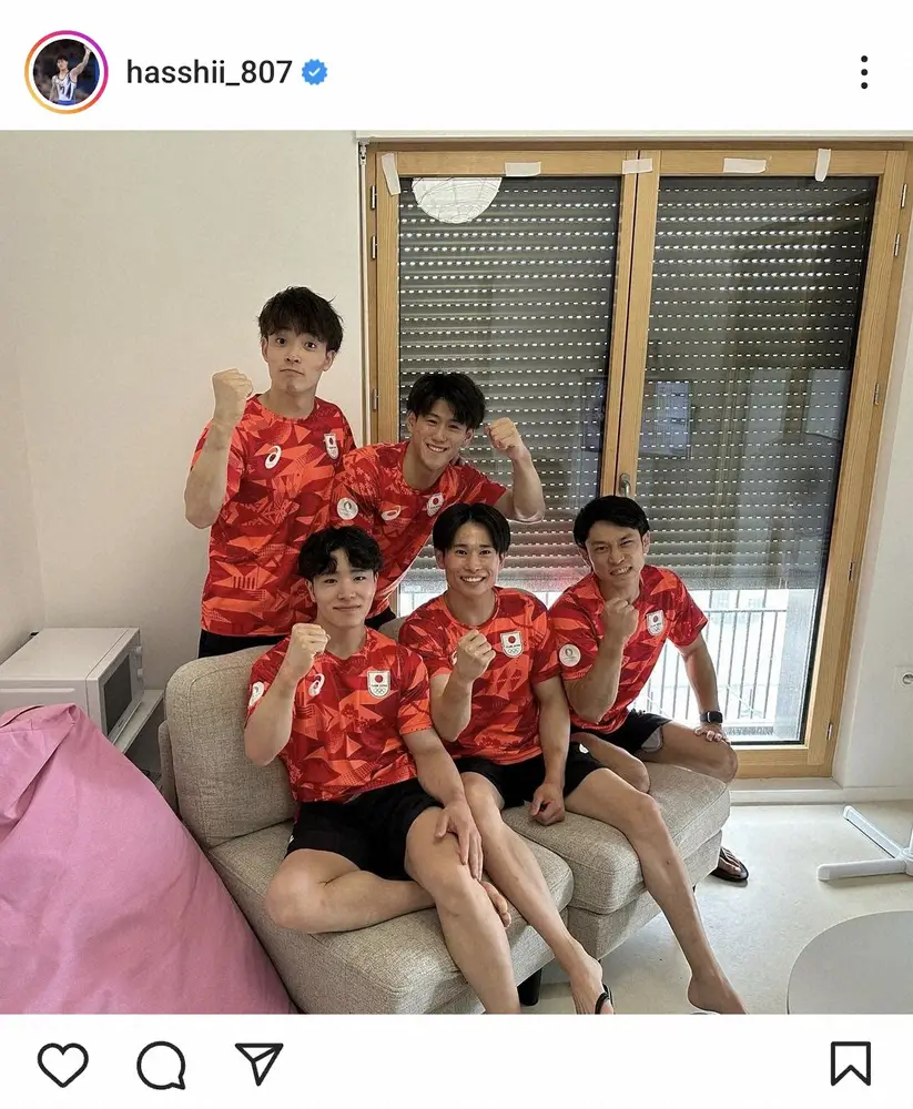 選手村と思われる一室での自身と、岡慎之助、萱和磨、杉野正尭、谷川航がボーズを決める集合ショットをアップ。