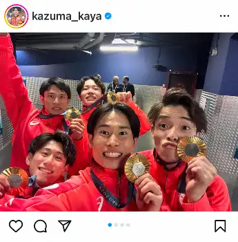大逆転で16年リオデジャネイロ五輪以来となる団体で金メダルを獲得した男子体操・日本代表の主将、萱和磨(27=セントラルスポーツ)が30日、自身のインスタグラムを更新。表彰式後のオフショットとともに喜びをつづった。