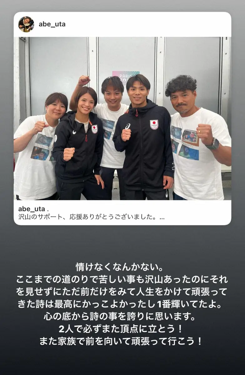 パリ五輪の柔道男子66キロ級で2連覇を達成した阿部一二三(26=パーク24)が30日までに自身のインスタグラムのストーリーズを更新。妹の詩(24=パーク24)をねぎらった。